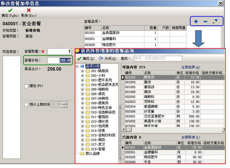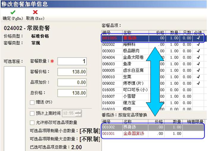 可设置允许部分菜替换指定的菜品,或选择可选菜品,总价格不变