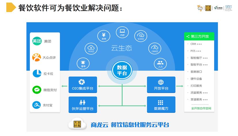 天财商龙作为餐饮信息化行业领军品牌,持续在产品端发力,除了夯实传统优势的门店运营及连锁管理产品,重点着眼于数据产品及云供应链产品的研发,力求用不断的突破和跨越,为餐饮企业和消费者带来不同凡响的价值和体验。目前,旗下拥有8大主力产品,涵盖餐饮ERP、O2O、CRM及SCM等各个领域,强大的产品矩阵,能够满足不同业态、不同发展阶段的餐饮企业需求,成为真正匹配全行业需求的餐饮信息化软件供应商!