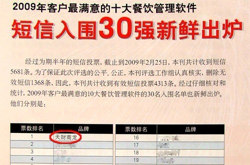 经过为期半年的短信投票,截止到2009年2月25日,共计收到短信5681条。为了保证此次评选的公平、公正,评选组认真核实,删除无效短信1368条,共计收到有效短信投票4313条。经过仔细核对和统计,2009年客户最满意的10大餐饮管理软件的30名入围名单也新鲜出炉,天财商龙餐饮管理软件获得的短信票数稳居第一。经过严格的评测后,天财商龙餐饮管理软件被评为“最专业最权威餐饮管理软件品牌”。