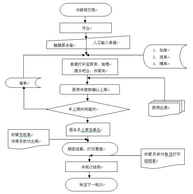 服务员在触摸屏上可以完成在指定客位上加单、对已点品项做赠送、删除、退单、查询已结账单、挂单、结班、查询报表、抽取大钞等。
