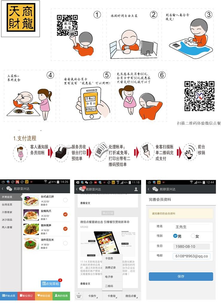 针对超过5亿的微信用户,天财商龙推出引爆餐饮营销新革命的微信餐厅,为餐饮企业与消费者之间建立真正的沟通,这种沟通方式不受时间和空间的限制;同时,其创新的思路为餐饮企业开辟了全新的经营领域;即商家公众号变成微信餐厅,可以将商家的餐厅的所有菜单全部放在微信餐厅上。