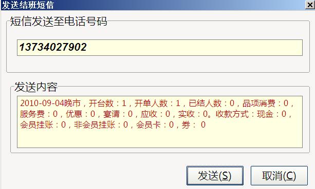 结班完毕,自动弹出短信发送,发送当班营业情况到指定的手机
