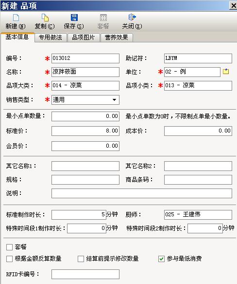 设置菜品编号、名称、类别、标准价、成本价、标准时长、制作厨师、做法等