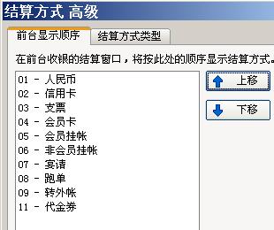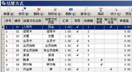 常用的结算方式维护,方便设置收银操作时的快捷键及排列顺序