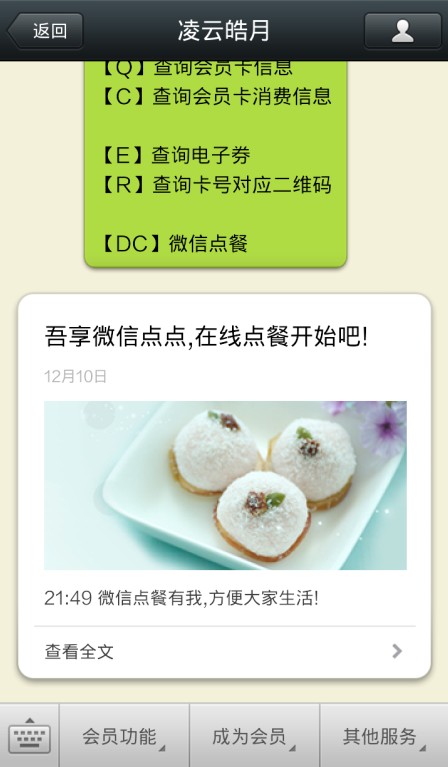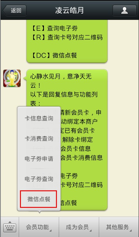 1.手机打开微信公众账号,使用点餐功能