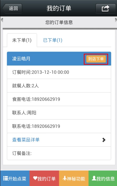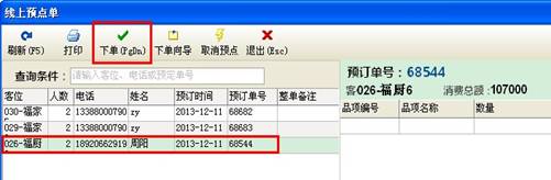 10.在线上预订单列表里,选择相关预订信息,点击下单按钮,便可以完成开台