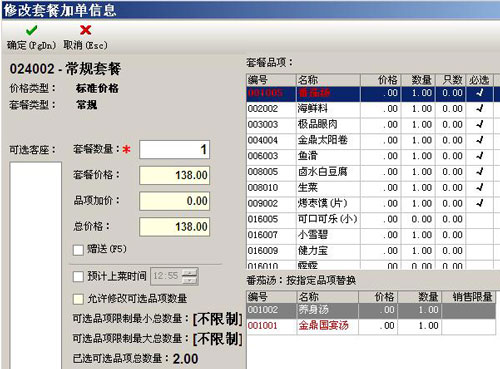  选择宴会套餐时,可临时增加或取消菜品,可调整套餐价格