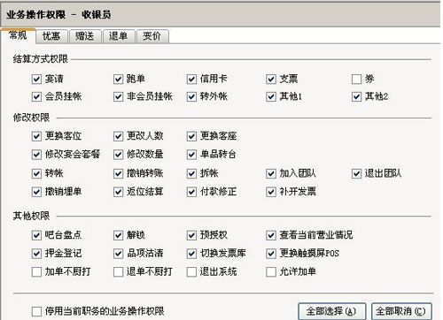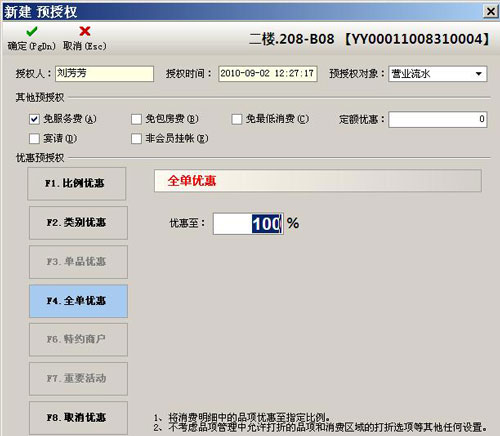 在台位结账之前做打折、免服务费等特殊操作的预授权处理,方便结账时操作。