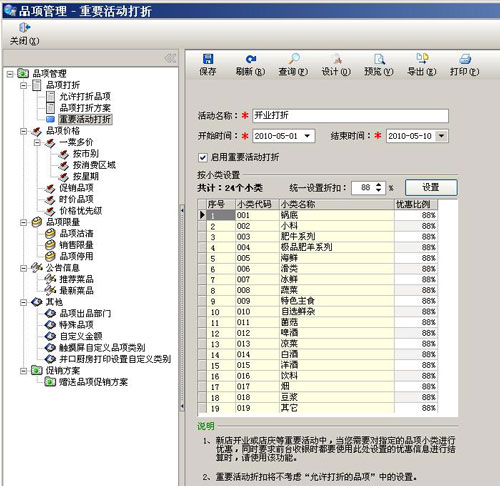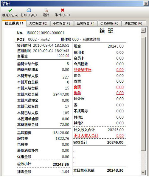  显示当班的营业情况及收款情况,可选择打印菜品大类或小类的销售情况