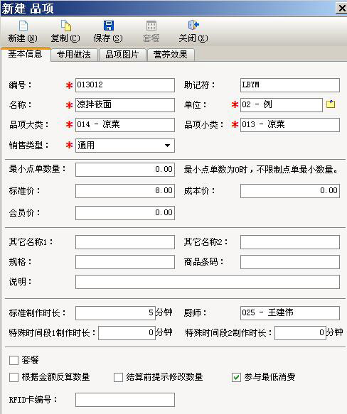  设置菜品编号、名称、类别、标准价、成本价、标准时长、制作厨师、做法等