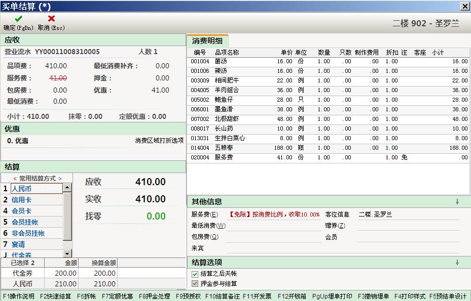多种结算方式、多种优惠方式、免服务费包间费、拆分账目、结算备注说明等