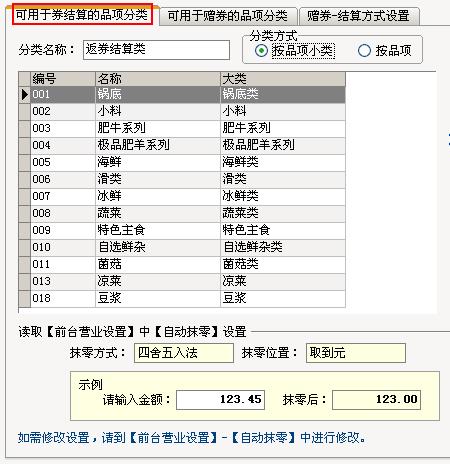 设置结算时返券的发放(某些类别的菜品参与返券)