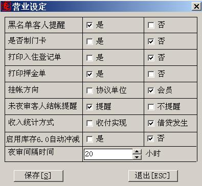 针对营业中的设置,包括是否制门卡、打印入住单、打印押金单、挂帐的设置、收入统计方式、夜审间隔时间等信息