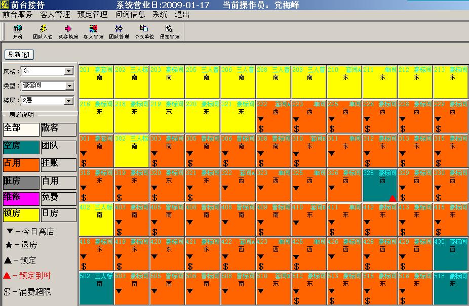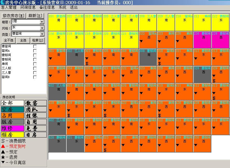 不同的颜色和标志区分所有房间的信息及状态,包括空房、占用、脏房、维修房、锁房、散客、团队、挂帐、自用、免费、日房等,还包括今日离店、已退房、已预定、预定到时、消费超限等状态的显示。