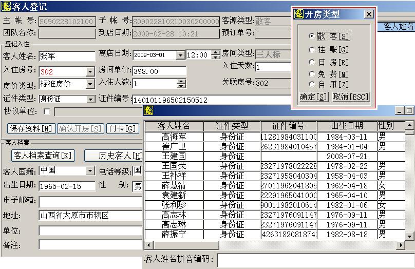 开房时可以选择各种开房类型,包括:散客、挂帐、自用、免费、日房等,录入客人的身份证号码,系统自动识别出所在的地址。可以查询入住登记过的客史资料,并可以选择做为当前登记的客人信息