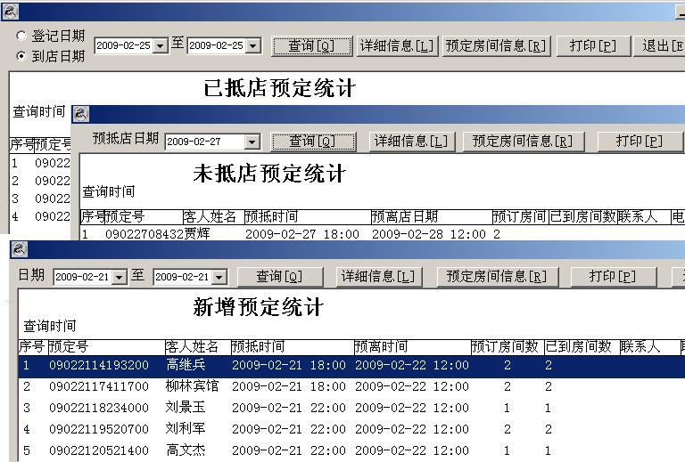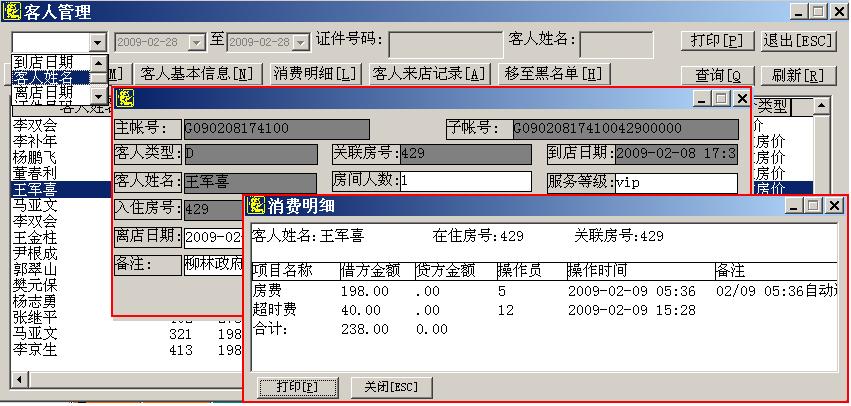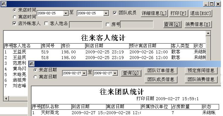 根据来店时间或离店时间查询往来客人,可以按照客人姓名或房号过滤;查询客人登记的详细信息、消费信息;查询团队的成员信息、成员消费信息、团队消费信息