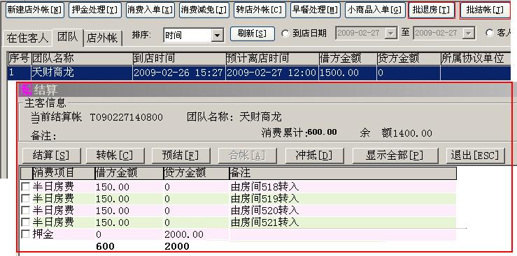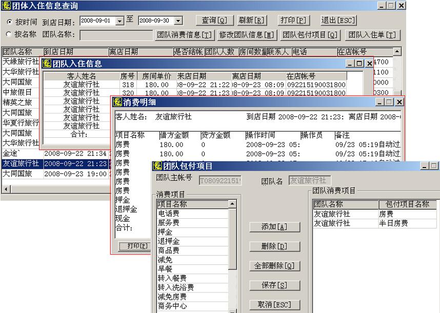 团队信息的管理,包括团队的查询、团队入住信息的查询、团队消费信息、包付项目的设置等功能。