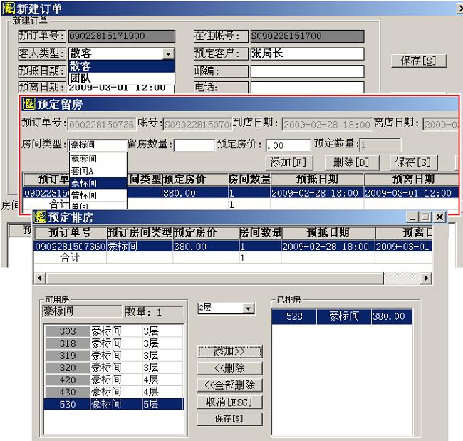 人数、房间数等,设置留房的房间类型、数量、房价,按照要求建立新订单时选择客源类型,录入预定客户的名称、预抵日期、预离日期、预定选择房间。