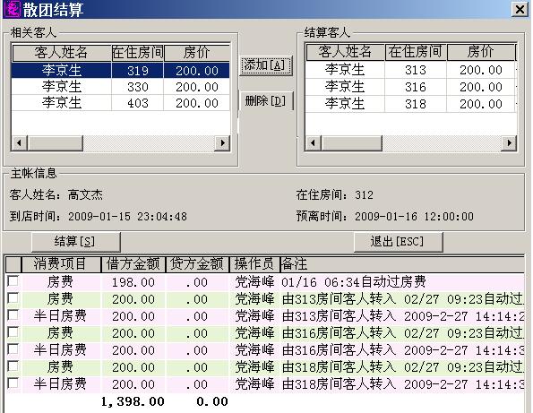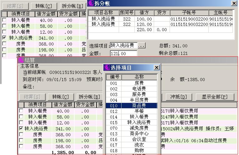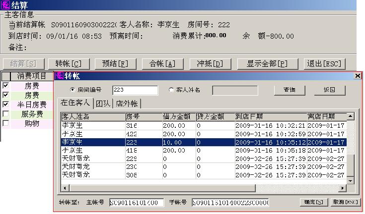将帐目的部分或全部消费项目转到指定客户帐目上,可按照房间编号、客人姓名过滤