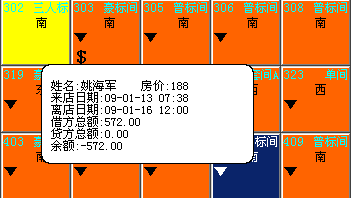 当房间状态为【占用】状态时,单击该房间图标,系统会弹出客人姓名、房价、来店日期、离店日期、借方、贷方以及余额