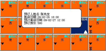 当房间状态为预订状态时,单击该房间图标,系统会弹出预订人姓名、抵店日期、预离店日期、预订房价等