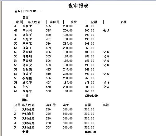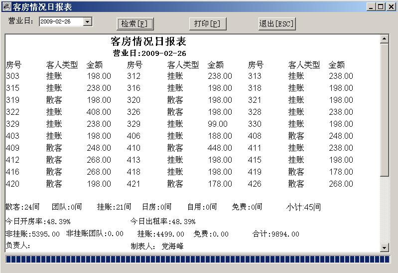 查询指定营业日内产生房费的房间明细,各种入住类型的房间数,开房率、出租率、非挂帐的房费、挂帐房费等