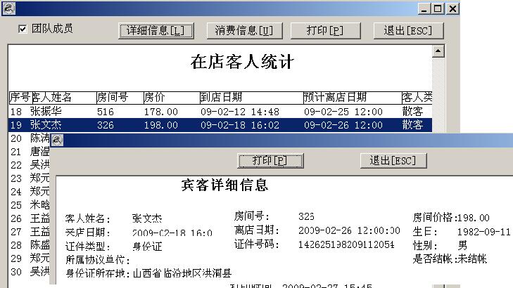 在住散客/团队的统计查询,散客登记信息、消费信息;团队的成员信息、消费信息