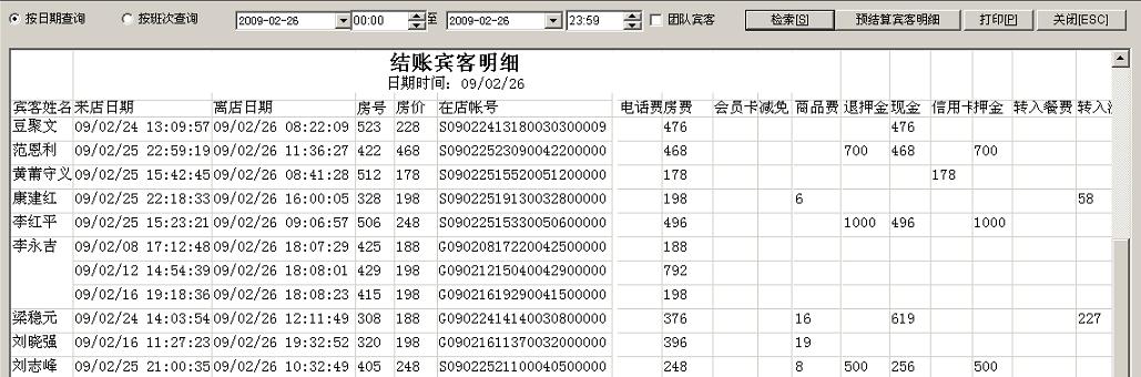 根据日期或班次查询宾客结算情况、预结算宾客明细