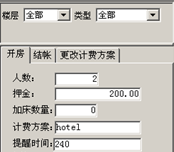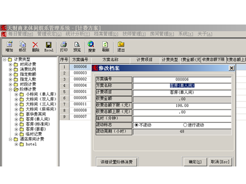 支持多种灵活的房间记费方案,如:按人数记费、时间段记费、指定数额记费,针对休闲行业的特点,特别支持钟点房阶梯记费、钟点房自动转化标准客房记费以及酒店记费方式