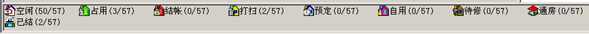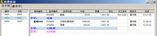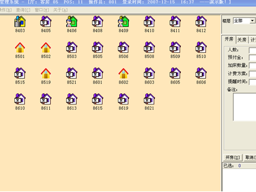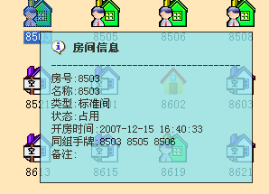 窗口式切换显示,从手牌界面切换到包房界面,可查询所有包房状态,如:占用、空闲、打扫、已结帐、通房、免单房等;切换到技师界面,可查询显示所有技师状态