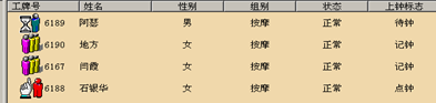 (如:按摩)查询,非正常状态可按照班次和停钟状态(如:病假、事假)查询